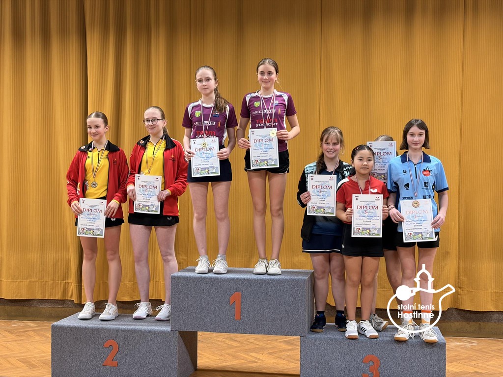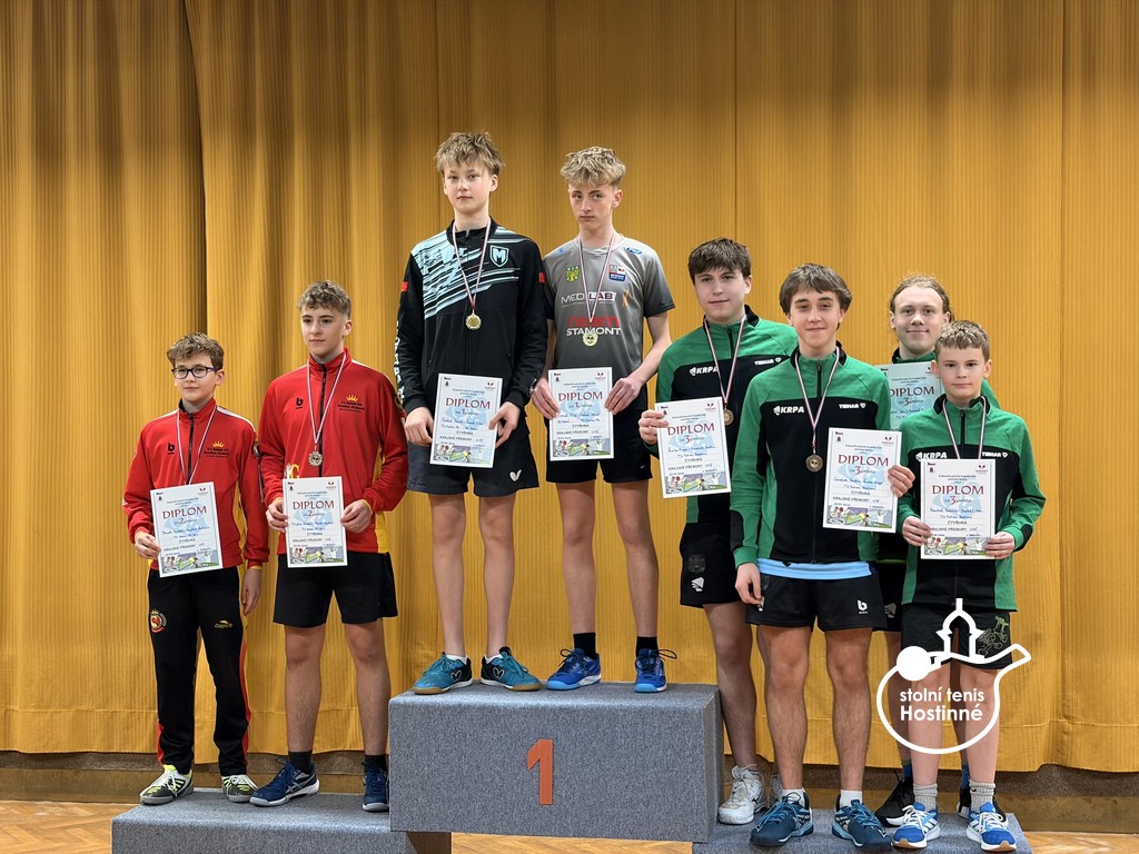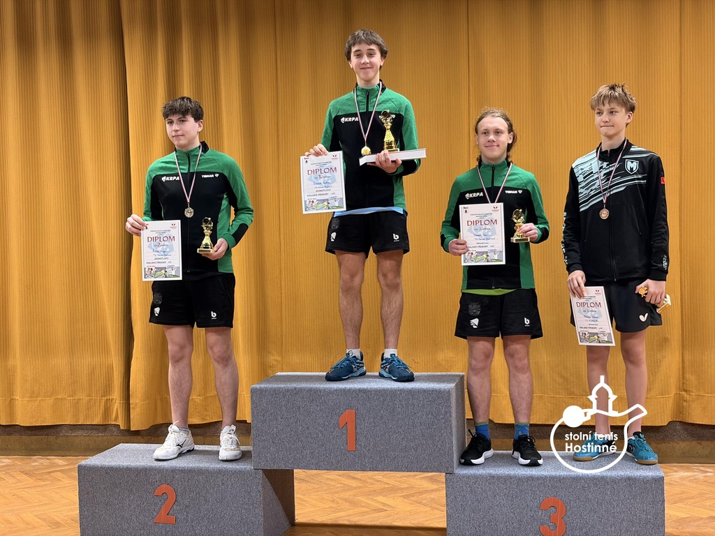 Fantastického výsledku jsme dosáhli na letošních prvních Krajských přeborech jednotlivců Královéhradeckého kraje. V sobotu na Dobrém se konaly KPJ staršího žactva a náš klub opět přepisuje historii klubu. Poprvé v historické paměti nastala situace, že jsme na vrcholu sezóny Královéhradeckého kraje v podobě Krajského přeboru jednotlivců staršího žactva obsadili první tři místa ve dvouhře!!! Neskutečný milník se podařil Radimovi Gazárkovi, Hugovi Šmikovi a Janu Dostálovi!!! Zcela jsme ovládli přebory i bez našeho nejlepšího kadeta Tomáše Matušky, o to cennější vystoupení našich dětí je. Ale postupně. Na tento turnaj se nominuje pouze 24 nejlepších hráčů a 12 hráček Královéhradeckého kraje. Náš klub reprezentovala šestice hráčů. Radim Gazárek, Hugo Šmika, Jan Dostál, Dominik Bartoš, Petr Krejčí a Máťa Šmiková. Všechny děti prokázaly ohromný vzestup formy a na turnaji předvedly skvělé výkony podtržené výsledky. V základních čtyřčlenných skupinách chlapců a šestičlenných skupinách dívek jsme vystrčili drápy. U Radima a Huga se výhry ve skupinách očekávaly. Honza Dostál nezůstal pozadu a Dominik Bartoš velmi překvapil, když porazil Daňka ze Sokola Hradec Králové a také vyhrál skupinu. Velká škoda Petra Krejčího, kterého dělily pouhé 3 míčky od postupu ze skupiny. Máťa Šmiková postoupila překvapivě z druhého místa do čtvrtfinále. Svoji šanci ve dvouhře bohužel nevyužila a v boji o medaili soupeřce podlehla. Další překvapení nás čekala. Dominik pokračoval ve skvělé jízdě a po další výhře postoupil do čtvrtfinále. Věkem mladší žák odehrál fantastický zápas i s horkým favoritem Danielem Skákalem z Montasu Hradec Králové, když se rozhodovalo v koncovkách čtyř setů. Nakonec odešel spokojenější hradecký hráč, který musel s o dva roky mladším Dominikem ukázat to nejlepší ze svého hráčského umění. Do čtvrtfinále se po výhře dostal i Jan Dostál, los mu přidělil favorita zápasu a druhého nasazeného hráče Antonína Hejduka ze Sokola Hradec Králové. Honza začal svěle, v prvním setu si vybojoval náskok, ale Hejduk zkušeně otáčí. Druhý set se nesl ve znamení uklidnění favorita. Stav 0-2. Třetí set našemu hráči na začátku nevyšel, prohrával již 4-8, ale nevzdal se a vybojoval ho pro sebe. Čtvrtý set Honza ovládl. Srovnáno. Rozhodující set a smolný začátek 0-3 po dvou prasátkách. Ani to Honzu nezlomilo, míček po míčku si šel pro svůj životní výsledek. Odvahou a sebedůvěrou toho opravdu dosáhl!!! Výborný skalp 16. hráče žebříčku ČR kadetů a pro Honzu jistá medaile ve dvouhře. Bravo!!! Radim Gazárek a Hugo Šmika plnili v prvních kolech pavouka role favoritů a své zápasy po jednoznačných výkonech ovládli. Oba se probojovali mezi nejlepší čtyři hráče. Radim nadále v semifinále poráží nebezpečného Daniela Skákala, Hugo si to o finále rozdal s Honzou. Hugo v koncovkách využil zkušenosti v bojích o medaile a Honzu poráží. Finále bylo opravdovým vyvrcholením turnaje. Nádherné výměny a vyrovnaný průběh. Vyhrát mohl jenom jeden a tím byl šťastnější Radim. Lépe to již nelze, máme první tři místa ve dvouhře na Přeborech Královéhradeckého kraje!!! A přidáváme další medaile. Máťa Šmiková si odvezla dvě bronzové medaile ze čtyřhry s Vanesou Gill z Dobrého a ze smíšené čtyřhry spolu s Radimem. Hugo a Radim přidali bronz ve čtyřhře chlapců stejně jako Dominik Bartoš a Jan Dostál. Neskutečný sportovně historický příběh je na světě!!! Velká gratulace našim hráčům!!!